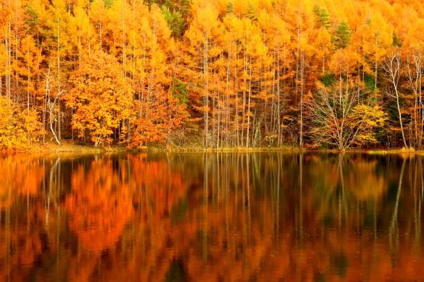 御射鹿池…季節ごとに色を変え、黄金色に黄葉する「カラマツ」